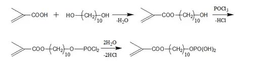MDP is synthesized according to the following reaction. At first, 10-hydroxydecy methacrylate is synthesized by reaction with methacrylic acid and 1,10-decandiol. Next, phosphoryl chloride is added to 10-hydroxydecy methacrylate, then, the bonding of P-Cl is hydrolyzed.[2]