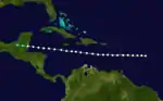 A hurricane was first observed well east of the Lesser Antilles on August 26.[4] The storm moved westward and brought severe weather to Martinique, including hurricane-force winds.[2] Throughout its trek across the Caribbean Sea, the system maintained winds of 80 mph (130 km/h). Late on August 31, the hurricane made landfall in Belize District of Belize.[4] Off the coast, several ships were damaged or sunk. The brig Antonio, the Hannah, and the bark Berkshire were among the ships that capsized.[2] On land, tides up to 5 ft (1.5 m) above normal caused coastal flooding in Belize. This storm has been paleotempestologically traced in sediment near Gales Point.[5] The system steadily weakened over land.[4]
