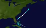 A low pressure area developed into a tropical depression about 75 mi (121 km) east of Florida at 00:00 UTC on September 18. It is estimated that the depression reached tropical storm intensity about 12 hours later,[6] based on ships reporting near-tropical storm force winds.[3] The storm drifted northeast and slowly strengthened, becoming a hurricane on September 20. The system made have interacted with the previous storm, which was at Category 3 intensity and located near Bermuda on September 21. Intensifying slightly further, the hurricane peaked with maximum sustained winds of 80 mph (130 km/h) and a minimum barometric pressure of 987 mbar (29.1 inHg) at 12:00 UTC on September 22,[6] with both estimated using observations from a ship and the pressure-wind relationship.[3] However, by September 23, the cyclone weakened to a tropical storm. After briefly accelerating, the storm curved northward and drifted,[6] before being absorbed by an extratropical storm about 165 mi (266 km) southeast of Massachusetts by 00:00 UTC on September 25.[6][3] This hurricane was not considered a tropical cyclone until reanalysis in 2009. Tropical storm force winds were reported in Florida, North Carolina, and New Jersey.[3]