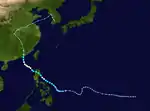 Typhoon Gloria developed on September 5, over the open waters of the West Pacific. The storm rapidly intensified to a peak of 155 mph on September 9. It weakened as it continued west-northwestward, and made landfall on extreme northeastern Taiwan on September 11, as a 100 mph typhoon.[22] The typhoon caused severe flooding in Northern Taiwan and killed hundreds of people.[23] Gloria continued westward, and hit eastern China that night as an 85 mph typhoon. The storm looped over land to the northeast, and dissipated on September 13, to the east of China. Gloria killed 239 people, and left 89 missing.[23]