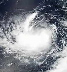 In late July to early August, an organized thunderstorm cluster persisted within the Intertropical Convergence Zone (ITCZ). Upon further development, the disturbance was designated as a tropical depression as it tracked swiftly west, the first and only cyclone to form in the central Pacific throughout the season. Despite initial forecasts of a minimal tropical storm, increasing wind shear and cooler ocean temperatures prompted the depression to instead dissipate by 00:00 UTC on August 5, having only attained peak winds of 30 mph (45 km/h).[25]