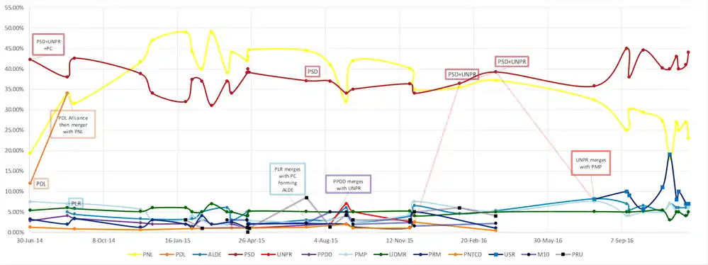 In June 2015, the left-wing National Union for the Progress of Romania (UNPR) which was previously in the Centre Left Alliance (ACS) with the Social Democrats (PSD), absorbed the remainders of dissolved populist PP-DD[19] after the latter's founder Dan Diaconescu was convicted for extortion.[20] UNPR president Gabriel Oprea advanced an independent list for his party for the 2016 parliamentary election.[21] Though it aimed to win 10% of national vote on its own,[22] the party also reaffirmed its commitment to the Centre Left Alliance (ACS) with the PSD.[23] However, in July 2016, UNPR joined the right-leaning People's Movement Party (PMP) led by former president Traian Băsescu, despite protests from some UNPR members.[24][25] Oprea, himself under investigation for abuse of power, resigned from the party and declared his intention to leave politics.[26]