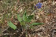 Pacific hound's tongue is native to western North America from British Columbia to California, where it grows in shady areas in woodland and chaparral. On the forest floor of California oak woodlands typical plant associates are Calochortus luteus, Delphinium variegatum and Calochortus amabilis.[3] It is a perennial herb producing an erect stem 30 to 90 centimeters tall from a taproot. The leaves are mostly located around the base of the plant, each with an oval blade up to 15 centimeters long held on a petiole. The inflorescence is a panicle of flowers on individual pedicels. Each five-lobed flower is bright to deep blue with white appendages at the center. It is 1 to 1.5 centimeters wide. The fruit is an array of four slightly bristly nutlets.[4]