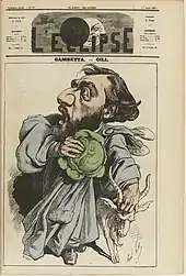 André Gill (17 October 1840 – 1 May 1885) was a French caricaturist. Born Louis-Alexandre Gosset de Guînes at Paris, the son of the Comte de Guînes and Sylvie-Adeline Gosset, Gill studied at the Royal Academy of Painting and Sculpture. He adopted the pseudonym André Gill in homage to his hero, James Gillray.[1] Gill began illustrating for Le Journal Amusant, but he became known for his work for the weekly four-sheet newspaper La Lune, edited by Francis Polo, in which he drew portraits for a series entitled The Man of the Day. He worked for La Lune from 1865 to 1868. When La Lune was banned, he worked for the periodical L'Éclipse from 1868 to 1876. Gill also drew for famous periodical Le Charivari.
