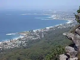![]() Lookout from the Illawarra Escarpment above Wombarra over the northern Illawarra plain viewing Austinmer in the foreground, Thirroul, Bulli, Wollongong up to Port Kembla in the far distance. | |||||||||||||||