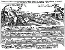 Since the beginning of April 1631, Magdeburg was besieged by imperial troops. The city's commandant Falkenberg was ordered by Gustavus Adolphus to hold the city for at least two months. Initially, Falkenberg had been able to take advantage of Tilly's hesitation for his siege, by strengthening the city's defenses and reorganizing his 2,500-strong garrison to be supported by 5,000 armed citizens.[41] But after the fall of Frankfurt, Tilly returned to Magdeburg at the end of April. He systematically attacked the city's outer defenses from several sides, which were gradually abandoned by the Swedish defenders. The Imperial troops dug trenches which, by mid-May, ran only five meters from the city's walls. On May 18, Tilly issued a final ultimatum for surrender to the city, which was subsequently refused by the city's counsil. On May 19, Tilly held a council of war with his generals where they decided to make a final assault on the city from six directions the following day.[43] During the morning of 20 May, the city was bombarded by Tilly's guns and Imperial troops broke into the city from several directions. The city was set on fire, Falkenberg and the entire city garrison were massacred, and the Imperial troops pillaged the city for several days while committing cruel acts of violence against the city's 25,000 inhabitants. By the time Tilly ordered an end to the looting on 24 May, Magdeburg was turned into a smoldering ghost town, resulting in the deaths of around 20,000 inhabitants.[44][39][45][46]
