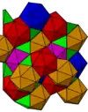 This honeycomb is represented in the boron atoms of the α-rhombohedral crystal. The centers of the icosahedra are located at the fcc positions of the lattice.[2]