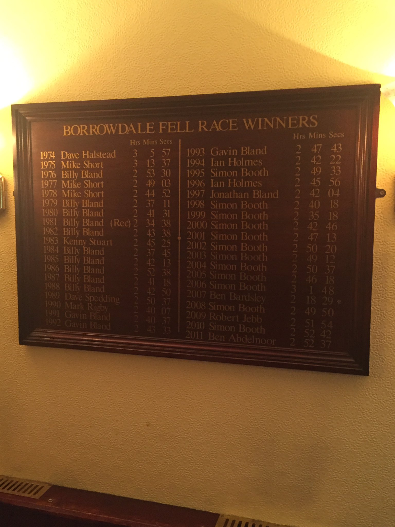 A board showing the winners of the race is on permanent display in the Scafell Hotel.[12]