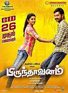 Brindavanam is a 2017 Indian Tamil-language comedy drama film directed by Radha Mohan and produced by Shan Sutharsan.[2] The film stars Arulnithi and Vivek, while Tanya portrays the leading female role. Featuring music composed by Vishal Chandrasekhar, the film began production during August 2016 and was released on 26 May 2017.[3][4]