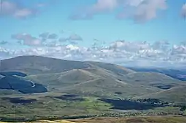 The usual route of ascent is from the A713 road to the west at the "Green Well of Scotland" a mile north of Carsphairn.[4] Despite its height, it is a relatively easy hill to climb - over some rough grass, with no steep slopes and with a very flat summit area - though there are areas of more rugged ground on the outlying peaks of Beninner and Moorbrock. For most of the route, there are excellent views westward over the Glenkens[5] to the Rhinns of Kells in the Galloway Hills. According to a tourist information board placed at The Green Well at the start of the track, in good conditions, the mountains of England, Wales, Ireland and the Highlands of Scotland can be seen from the summit, as well as Glasgow and Edinburgh, some 80 miles distant.