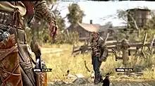 In Bound in Blood, duels switch the game to third-person, with the player needing to keep the character's hand as close to his gun as possible without touching it.[23] At the same time, the player needs to keep the opponent lined up in the centre of the screen. When the time comes to draw, a bell rings, and the player must draw, aim, and fire as quickly as possible.[48][49]
