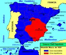 The council met for the last time on 27 March 1939.[35] That day the council left for Valencia, and Casado told his troops to disarm and offer no resistance to the rebels.[29] The next day Franco's forces entered Madrid.[35] Julián Besteiro and Rafael Sánchez Guerra were the only two members of the council who remained in the capital when rebel troops entered the city. They received the first indictment for war crimes to be tried by military tribunals.[38] By 31 March 1939, the rebels had control of all Spanish territory.[39]