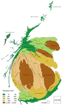 The Central Belt of Scotland is the area of highest population density within Scotland. Depending on the definition used, it has a population of between 2.4 and 4.2 million (the country's total was around 5.4 million in 2019), including multiple Scottish cities; Greater Glasgow, Ayrshire, Falkirk, Edinburgh, Lothian and Fife.