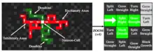 CoDi uses a von Neumann neighborhood modified for a three-dimensional space; each cell looks at the states of its six orthogonal neighbors and its own state. In a growth phase a neural network is grown in the CA-space based on an underlying chromosome. There are four types of cells: neuron body, axon, dendrite and blank. The growth phase is followed by a signaling- or processing-phase. Signals are distributed from the neuron bodies via their axon tree and collected from connection dendrites.[1] These two basic interactions cover every case, and they can be expressed simply, using a small number of rules.
