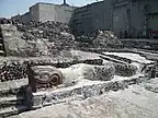 Based on second-hand accounts, the wall at Tenochtitlán was thought for many years to have enclosed the entirety of the sacred precinct of Tenochtitlán and consist of numerous snakes,[4] but archaeological work in 1981 revealed that the sacred precinct of the city extended beyond the coatepantli and that the coatepantli consisted of two walls in the form of large snakes with painted heads, surrounding the Templo Mayor.[3][4] One snake was situated to the north of the temple and was painted blue to represent the rain god Tláloc. The other, around the southern side of the pyramid, was painted ochre and represented the war god Hitzilopochtli.
