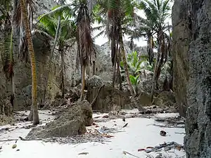 Its growth is more prominent in the island's lower terrace rather than the interior, and in villages on the eastern side; Mutalau to Lakepa on the northern part of the island account for its largest plantations.[6] In the 1880s, coconut plantations had been created by clearing half the area of the island.[7] A coconut cream factory closed in 1991, subsequent to hurricane damage.[8] As of 2013, the Food and Agriculture Organization reports 3,200 tonnes of coconut production, valued at INT$385,830,[9] from an area of 3,300 hectares (8,200 acres) with an average yield of 9,697 hectograms per ha (969.7 tons/ha).[10]