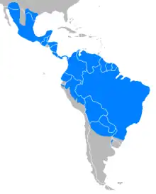 The collared peccary is widespread throughout much of the tropical and subtropical Americas, ranging from the Southwestern United States to northern Argentina. They were reintroduced to Uruguay in 2017, after 100 years of extirpation there.[9] The only Caribbean island where it is native, however, is Trinidad. Until fairly recently, it was also present on the nearby island of Tobago, but is now exceedingly rare (if not extirpated) due to overhunting by humans. An adaptable species, it inhabits deserts, xeric shrublands, tropical and subtropical grasslands, savannas, shrublands, flooded grasslands and savannas, tropical and subtropical dry broadleaf forests, and several other habitats; it is also present in habitats shared by humans, merely requiring sufficient cover. Peccaries can be found in cities and agricultural land throughout their range, where they consume garden plants. Notable populations are known to exist in the suburbs of Phoenix and Tucson, Arizona.[10][11]