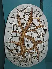 Septarian concretions (or septarian nodules) are carbonate-rich concretions containing angular cavities or cracks (septaria; sg. septarium, from the Latin septum "partition, separating element", referring to the cracks or cavities separating polygonal blocks of hardened material).[34][35] Septarian nodules are characteristically found in carbonate-rich mudrock. They typically show an internal structure of polyhedral blocks (the matrix) separated by mineral-filled radiating cracks (the septaria) which taper towards the rim of the concretion. The radiating cracks sometimes intersect a second set of concentric cracks.[36][34] However, the cracks can be highly variable in shape and volume, as well as the degree of shrinkage they indicate.[37] The matrix is typically composed of argillaceous carbonate, such as clay ironstone, while the crack filling is usually calcite.[36][34] The calcite often contains significant iron (ferroan calcite) and may have inclusions of pyrite and clay minerals. The brown calcite common in septaria may also be colored by organic compounds produced by bacterial decay of organic matter in the original sediments.[38]