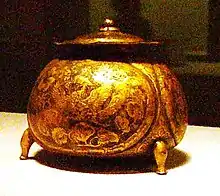 This first law was followed by a second law on December 15, 1897 giving supplementary provisions for designating works of art in the possession of temples or shrines as "National Treasure" (国宝, kokuhō); religious architecture could be designated as "Specially Protected Buildings" (特別保護建造物, tokubetsu hogo kenzōbutsu).[10][17] The main criteria for designation were "artistic superiority" and "value as historical evidence and wealth of historical associations", but also age was considered in the designation.[18] Designated artworks could be from any of the following categories: painting, sculpture, calligraphy, books and handicrafts; subsequently swords were added. However the law was limited to items held by religious institutions, leaving privately owned articles unprotected.[7] Funds for the restoration of certain works of art and structures were raised from 20,000 yen to 150,000 yen and fines were set for the destruction of Cultural Properties. Owners had to register designated objects with newly created museums, which were granted first option in case of sale.[10] Initially, 44 temple and shrine buildings and 155 relics were thus designated, including the kon-dō at Hōryū-ji.[7][10]