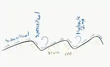 In density flows, antidunes can turn into cyclic steps by wave breaking.[12] Fluid flow is Froude-supercritical over the entirety of antidunes, whereas the flow alternates between the sub- and super-criticality over cyclic steps (with hydraulic jumps between cycles). Additionally, cyclic steps tend to have a much larger wavelength-to-flow-thickness ratio and a higher suspension index (ratio of shear velocity to sediment settling velocity). Antidunes are typically unstable (although they can be made stable in laboratory conditions), in contrast to cyclic steps. Despite these differences, it is not uncommon for researchers to incorrectly label a cyclic step as an antidune.[10] Cyclic steps also have similarities to chute-and-pool features. Like cyclic steps, chute-and-pool flows undergo hydraulic jumps,[12] although the flow does not undergo repeated transitions from sub- to super-critical. When the flow remains subcritical over the whole feature, ripples and dunes form instead.[10]