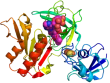 ![]() Crystal structure of gcoB (cartoon diagram) complexed with FAD (magenta spheres) and an iron–sulfur cluster (orange/yellow) based on PDB: 5OGX.[1] | |||||||