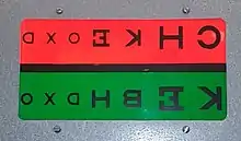 A duochrome test is a test commonly used to refine the final sphere in refraction (undercorrection and overcorrection), which makes use of the longitudinal chromatic aberration of the eye. Because of the chromatic aberration of the eye, the shorter wavelengths (green) are focused in front of the longer red wavelengths. It is assumed that best vision is attained when the yellow wavelengths are focused on the retina.[1]