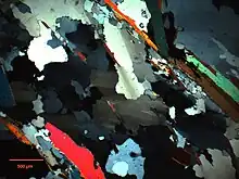Following an increase in temperature, the dominant texture changes to one marked by the presence of distinct subgrains. Recognizable in thin section by a more polygonized texture, the increased softening of the quartz allows for more thorough reduction of internal stresses. Recrystallized grains show relatively straight grain boundaries and little to no intragranular deformation feature, such as undulose extinction or deformation lamellae.[4] Volume proportion of recrystallized grains in this regime roughly ranges from 30-90%, forming subgrains not only in interstitial space, but also within larger crystals or ribbon grains. Subgrains and recrystallized grains are roughly equal in size and shape.