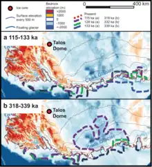 - ↑ Turney, Chris S. M.; Fogwill, Christopher J.; Golledge, Nicholas R.; McKay, Nicholas P.; Sebille, Erik van; Jones, Richard T.; Etheridge, David; Rubino, Mauro; Thornton, David P.; Davies, Siwan M.; Ramsey, Christopher Bronk (2020-02-11). "Early Last Interglacial ocean warming drove substantial ice mass loss from Antarctica". Proceedings of the National Academy of Sciences. 117 (8): 3996–4006. Bibcode:2020PNAS..117.3996T. doi:10.1073/pnas.1902469117. ISSN 0027-8424. PMC 7049167. PMID 32047039.