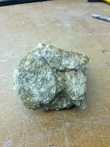 Granitic rock sample from Pilbara. The light/white/yellow color distinguishes it from greenstones also found in that region. TTG melts were the sources of rocks like these.