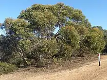 The species is associated with the western mallee subgroup which is characterised by several eucalypts including E. oleosa, E. moderata, E. incrassata, E. foecunda, E. eremophila and E. uncinata. The understorey is predominantly shrubby with species of Melaleuca and Acacia along with the occasional Triodia.[8]