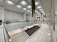 In late 2009, owner Brookfield Properties announced it would follow the example of Aon Center and, over three years, replace the tower's 45,000 marble panels with new ones in glass, those on the main expanses with a white ceramic frit and the corners in a bronze tint.[10][11] Brookfield and the co-owners also launched a multi-faceted rejuvenation program, including "upgrades to the building's mechanical, electrical, and lighting systems that will redefine the standard for enhanced performance, comfort, and greening". FCP's common areas including upper and lower level entrance and elevator lobbies, the retail concourse and Market Place were to also undergo renovation, with new natural stone flooring, fritted glass accents, brushed metal handrails, landscaping, and water features. The rejuvenation program design architects were Moed de Armas & Shannon Architects and Bregman + Hamann Architects were the architects of record.[11] The entire project, completed in 2012,[12] cost was in excess of CA$100 million, paid by the owner. This extensive capital improvement project was intended to provide a new exterior for FCP and eliminate the maintenance costs associated with marble upkeep.