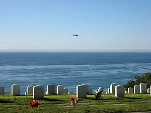 ![]() Fort Rosecrans National Cemetery, with the aircraft carrier USS Midway (CV-41) in the background. | |