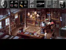Unlike newer graphical adventure games that use context-sensitive cursors which conduct the appropriate action when interacting with objects and people, the game makes use of action-specific cursors which perform the required action the player needs, provided they select that action's icon from the game-bar - "WALK", "LOOK", "ASK", "TALK", "PICKUP", "OPEN/CLOSE", "OPERATE", and "MOVE".[4] Items that can be collected from a location in the game, are stored in an inventory where they can be examined, interacted with, or combined with other items being carried. More importantly, items can be made an active icon in the game-bar, functioning in a similar manner to action icons by allowing it to be used with interactive objects in the game world.[5]