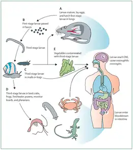 - ↑ Wang, Qiao-Ping; Lai, De-Hua; Zhu, Xing-Quan; Chen, Xiao-Guang; Lun, Zhao-Rong (2008-10-01). "Human angiostrongyliasis". The Lancet Infectious Diseases. 8 (10): 621–630. doi:10.1016/S1473-3099(08)70229-9. ISSN 1473-3099. PMID 18922484.