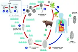 Eurytrematosis is a parasitic infection caused by the pancreatic trematode genus, Eurytrema.[16] This trematode genus primarily affects ruminants such as cattle and sheep, but has been known to infect humans as well.[17] The transmission cycle of eurytrematosis starts with eggs being excreted by an infected definitive host and being ingested by a terrestrial gastropod host. After ingestion, the eggs hatch and after several months, asexual sporocyst are created and start to produce cercariae, that are expelled into the environment by the first intermediate gastropod host. These cercariae are secreted through the mucus of the first intermediate gastropod host and are ingested by the second intermediate hosts, which is an insect species such as a grasshopper (Orthoptera) or an ant. The successful cercariae develop into mature metacercariae and wait for months within the second intermediate insect host. The transmission cycle is then completed when the second intermediate host is accidentally ingested by a ruminant, where the adult parasites are then able to reside in the bile ducts of the liver and the pancreatic ducts. In humans, accidental infection can occur through the consumption of contaminated water or food.