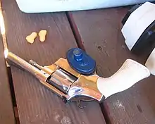 When a firearm is discharged it emits a very loud noise, typically close to the handler's ears. This can cause temporary or permanent hearing damage such as tinnitus. Hearing protection such as earplugs, or earmuffs, or both, can reduce the risk of hearing damage.[7] Some earmuffs or headphones made for shooting and similar loud situations use active noise control. Firearms may also have silencers which reduce the sound intensity from the barrel.