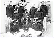 In 1908, Canada became a training ship for officer cadets for the planned Canadian navy.[15] Thus CGS Canada became Canada's first naval training ship and was, as stated by naval historians in Canada, the "Flagship of the embryonic Canadian Navy at the time, symbolic of the evolution of Canada from a dominion within the British Empire to a sovereign nation."[16] In 1909, the Fisheries crew was removed from the ship and volunteers from the Royal Navy Reserve were brought aboard to provide a higher level of naval training. However, Canada continued to be used as a fisheries patrol vessel.[17] In 1910, the Canadian navy was formed Canada escorted one of the nation's newly acquired cruisers, Niobe, into Halifax Harbour, with the new navy's cadets and the Director of the Naval Service, Rear Admiral Charles Kingsmill, aboard.[18]
