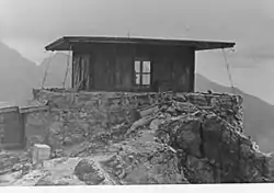 The Heaven's Peak Fire Lookout in Glacier National Park, Montana, USA, is significant as one of a chain of staffed fire lookout posts within the park. The one-story timber-construction with a flat roof was built in 1945. The flat, overhanging roof is anchored to the stone foundation with cables.[2]