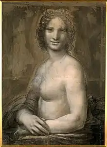 In contrast, Leonardo da Vinci departed from classical canons, with naturalistic figures designed according to his extensive studies of anatomy. Early on he was inspired by the energetic forms of Pollaiuolo, and The Battle of Anghiari is influenced by Michelangelo's The Battle of Cascina. Later, his deepening in anatomy gave his figures a resounding realism, where the scientific interest can be glimpsed, but at the same time they denote a certain heroic attitude, of moral and human dignity, which gave them a serene vital intensity.[76] However, despite this interest in anatomy, which he captured in hundreds—perhaps thousands—of drawings, which today are scattered in many museums and private collections, in his paintings he only made a few nude representations,[77] such as Bacchus (or St. John the Baptist, 1510–1515), or his Leda and the Swan, of which he made at least three versions between 1504 and 1506, and which is the vindication of the naked woman as a symbol of creative life, and no longer as an unattainable ideal.[Note 5] For Leonardo, the study of anatomy served him more to know the proportions of the figure to be represented—even if she was dressed—than as an end in itself; thus, for example, there is a half-naked drawing of the famous Mona Lisa, La Gioconda (1503), now in the Musée Condé in Chantilly.[78]