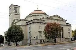 Holy Trinity Greek Orthodox Church is a historic Greek Orthodox church building near downtown Steubenville, Ohio, United States. Constructed for a large Methodist Episcopal congregation in the early twentieth century, it was acquired by the present occupants in 1945. Featuring Neoclassical elements such as a large dome and a prominent colonnade, it has been named a historic site.