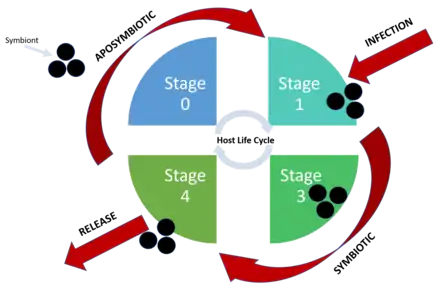 The life cycle of the host includes both symbiotic and aposymbiotic phases. The aposymbiotic phase generally begins in the germ cells, and during development, the host organism acquires the symbiont and translocates it to a symbiont-housing organ.[2] The host will release the symbiont before reproduction.