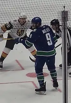 On June 22, 2019, on the second day of the 2019 NHL Entry Draft, Miller was traded to the Vancouver Canucks in exchange for Marek Mazanec, a third-round pick in the 2019 Draft and a conditional first-round pick in the 2020 NHL Entry Draft.[19] On October 28, during a 7–2 win over the Florida Panthers, Miller scored his 100th career goal.[20] That season, Miller would achieve the greatest all-around season of his career up until that point.[21] In his first season with the Canucks, Miller would either tie for the lead, or outright lead the team in goals (27), assists (45) and points (72) during the regular season, as well as tie for the playoff points lead (18).