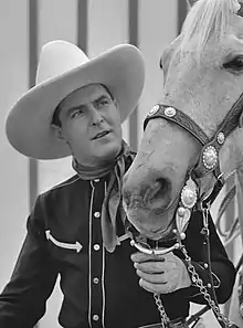 He first appeared in silent motion pictures in 1923 as a stuntman or supporting actor.[3] In 1924, he began working in western features, where his horsemanship and rugged good looks made him a cowboy star. Maynard's silent features showcased his daredevil riding, photographed fairly close so audiences could see that Maynard was doing his own stunts with his white stallion "Tarzan." The action scenes were so spectacular that they were often reused in films of the 1930s, starring either Maynard himself or John Wayne, or Dick Foran. (Wayne, and later Foran, starred in westerns for Warner Bros. and were costumed like Maynard to match the old footage.)