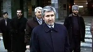 After April 2001, he became actively involved in work of Eurasia Party led by Russian nationalist Aleksandr Dugin, despite being officially wanted by police.[4] On June 28, 2001, he appeared on the Dugin party's press conference in Moscow to propose that Chechnya be divided into North Chechnya (the plains region within the frame of the Russian Federation) and South Chechnya (the mountain region largely independent from Russia, but still closely bonded to Russia and fiercely hostile to "Wahhabism", that is Islamic fundamentalism).