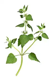 The common name "dead-nettle" has been derived from the German Taubnessel ("deaf nettle", or "nettle without a kernel"),[8] and refers to the resemblance of Lamium album[9] to the very distantly related stinging nettles, but unlike those, they do not have stinging hairs and so are harmless or apparently "dead".