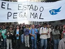 In May 2011, party members took part in the Global Marijuana March in Buenos Aires under the slogan The State is a bad trip (Spanish: El Estado pega mal).[21] The Liberal Libertarian Party support marijuana legalization claiming the State should respect individual actions as long they do not harm another individual's freedom.[9][22] The party argue that prohibition violates article 19 of the constitution[23] They also demanded dismissal of the charges against Matías Faray, who was detained for cannabis cultivation.[23][24]