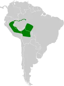 From central Bolivia, the range extends north through Amazonian Peru, (only crossing the southwest border areas of Brazil's Amazonas state), and extends downstream on the Marañón River and Amazon River down a riverine wildlife corridor approaching the Juruá River confluence.