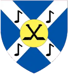 Azure on a saltire Argent surmounted by a bezant charged with two hockey sticks in saltire Sable four eighth notes Sable.