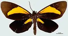 It is involved in Müllerian mimicry with the arctiid Crocomela flammifera.