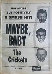 "Maybe Baby" is a rock-and-roll song written by Buddy Holly and the producer Norman Petty, and recorded by Holly and the Crickets in 1957. The single, released in January 1958 and credited to the Crickets, was a Top 40 hit in the U.S., the UK, and Canada.[2]